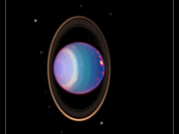 Com uma inclinação de seu eixo de rotação de quase 98° relativa ao plano da sua órbita, Urano gira praticamente “de lado” em torno do Sol. Esta orientação única no Sistema Solar é provável resultado de uma ou duas enormes colisões com objetos do tamanho da Terra quando o planeta ainda estava se formando, há cerca de 4,5 bilhões de anos.